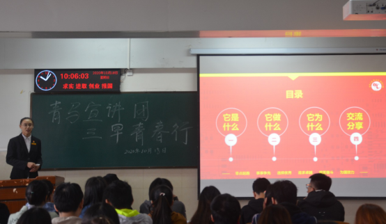 本次活动就“是什么”、“做什么”、“为什么”和“分享交流”四个部分对青马班进行了介绍。活动伊始,宣讲人白旭青对青马班的学员遴选机制、培养目标、培养机制和培养内容做出细致阐述,指出青马班旨在要建设一批“有理想”“有本领”“有担当”的时代青年。然后,宣讲人黄炼强调:青马班是一个人才济济的团体,班级成员在学干任职、学员成绩及科研水平、学员获奖等方面都处于出类拔萃的状态。“加入青马班,你就等于获得了一群益友、一个目标、一份坚定”,宣讲人在谈及个人经历时如是说道。随后,宣讲人白旭青用对比的方式讲述了青马班带给她的进步和转变,并将她自己的青马生活概括为“进步与精彩”。