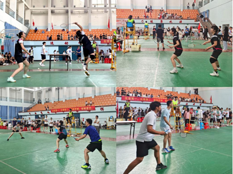 本次大赛设定采用三局两胜11分制,包括女子双打、男子双打、混合双打三个项目。上午8点,比赛在大家的欢呼雀跃声中拉开了序幕。选手们穿着轻便的运动装,斗志昂扬,活跃在各个赛场。只见羽毛球你来我往,让人目不暇接;加油声此起彼伏,赛场热闹非凡。经过一上午的激烈角逐,教体学院在小组循环赛中以绝对优势在五个学院中排名第一,脱颖而出,成功晋级八强赛。