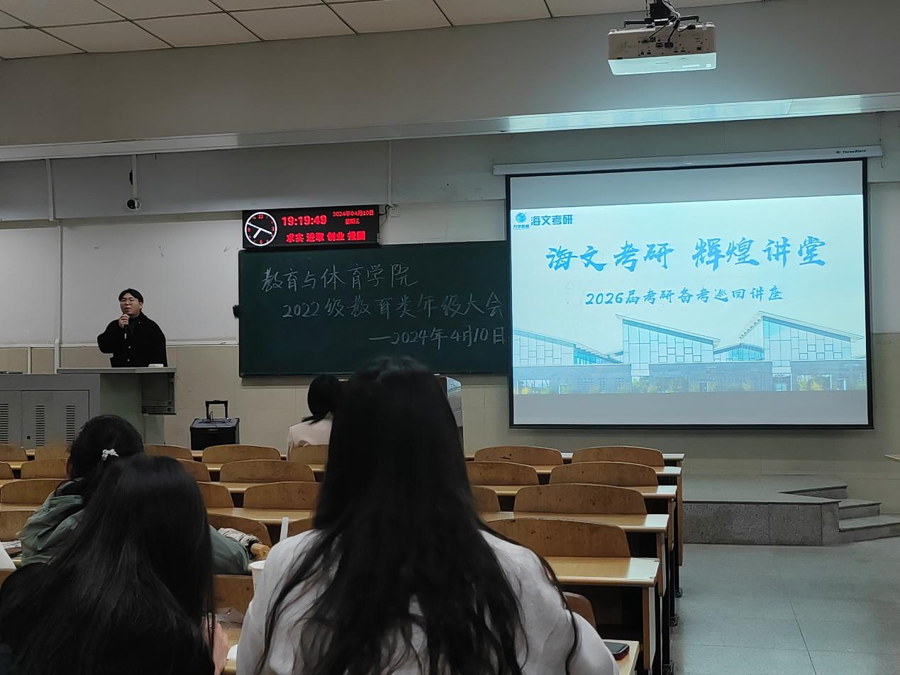为给同学们提供针对性和系统性的考研辅导,来自海文考研的赵老师给同学们分享考研常识。赵老师分别从考研的竞争格局全维度解读、院校专业选报方案、公共课及专业课考核要求三方面阐述了当前考研形势和就业创业情况,使同学们充分掌握考研第一动态。他表示,报考需要结合自我竞争力与社会需求,进行正确的选择与规划。经过赵老师深入浅出地解说,同学们对考研宏观布局有了进一步的认识。为表示对同学们的诚挚祝福与殷切期盼,海文考研机构向参会学生发放了免费的学习资料。