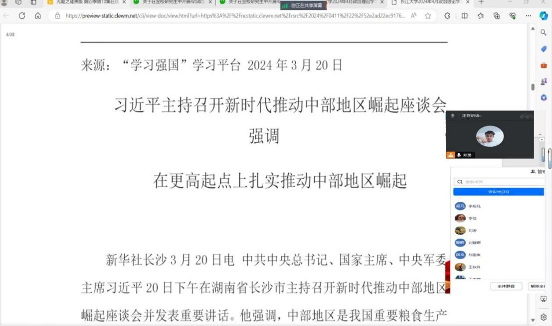 第一部分主要学习了习近平总书记重要讲话和重要批示指示。首先,习近平主持召开新时代推动中部地区崛起座谈会强调:在更高起点上扎实推动中部地区崛起;其次,习近平在湖南考察时强调:坚持改革创新求真务实,奋力谱写中国式现代化湖南篇章。最后,同学们重点学习人民至上的原则。
