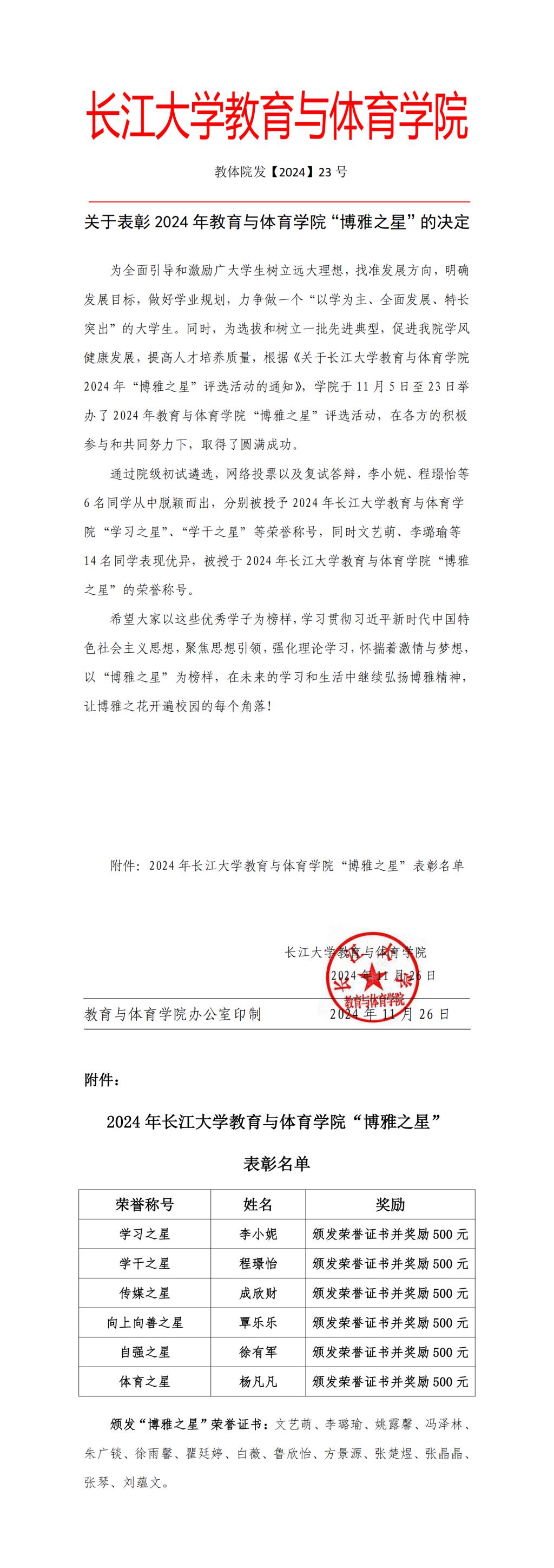 关于表彰2024年william威廉中文“博雅之星”的决定