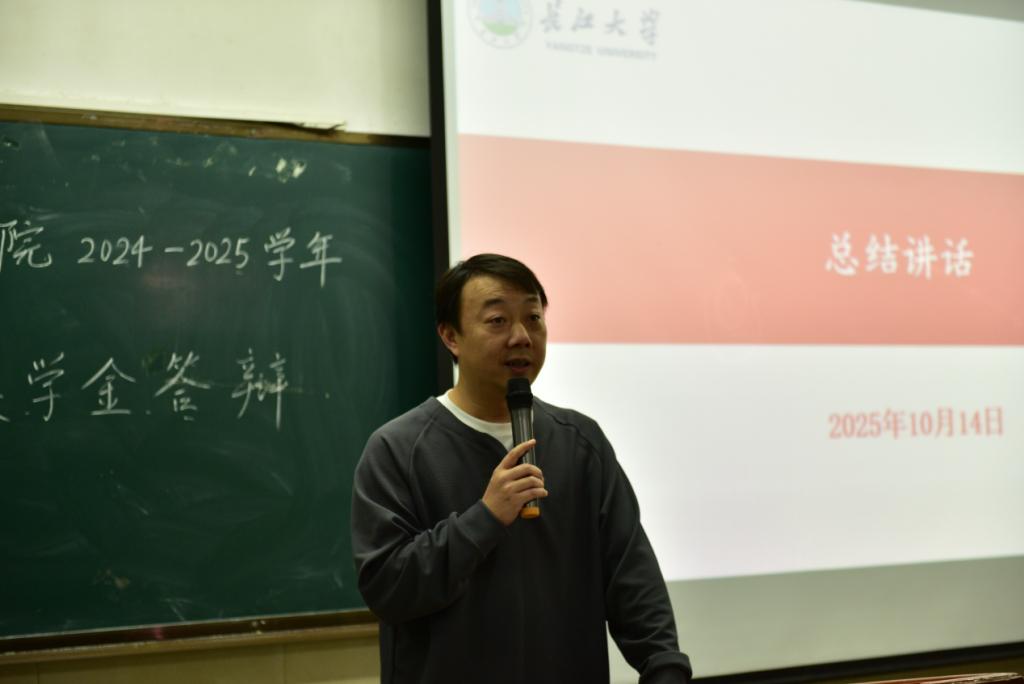 答辩结束后,党委副书记何可可作总结讲话。他首先对候选人们的优异表现和幕后工作者的付出给予了高度赞扬。他承诺,评委们将秉持公平公正的原则,严格监督评选过程,确保评审公开透明。此外,他希望未来获奖的同学能够走进低年级的班级进行宣讲,分享学习经验,发挥榜样力量,学院也会给予相应的支持。最后,他送给在场的各位同学们“改变”“思考”“作为”三个关键词,鼓励大家精益求精,不断改变;思考自己到底想成为什么样的人;如何带领同学们一起进步。