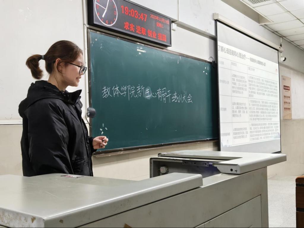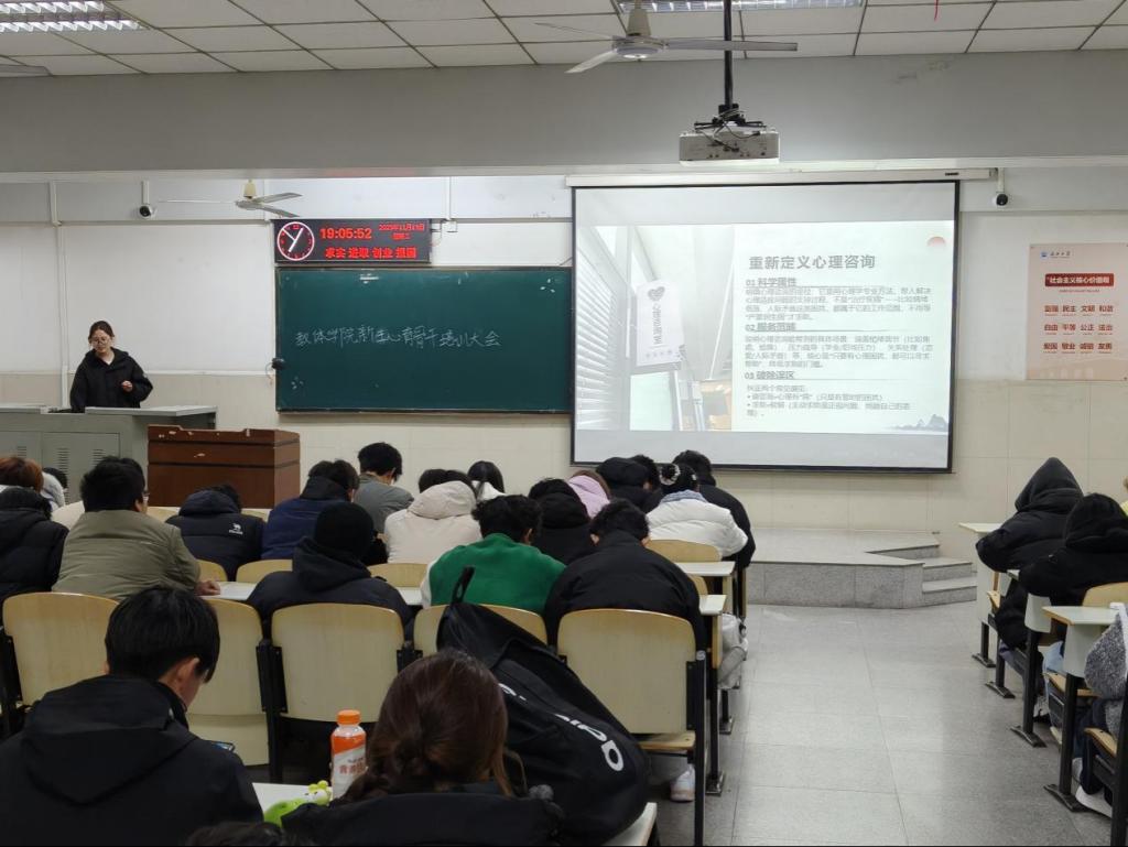 【通讯员 唐鑫 焦铄童 耿诗涵 曾雪晨等/摄 谷世家 王子润/文】为帮助我院2025级新生骨干提升心理自助与助人能力,更好地发挥心育骨干在学生群体中的作用,11月19日晚19时许,2025年秋季新生心育骨干培训大会在12教104顺利举行。大会由辅导员任雯婷老师与学院心育部组织,大一和研一学生骨干参与,学院主持部徐紫涵同学主讲,与会人数近200人。