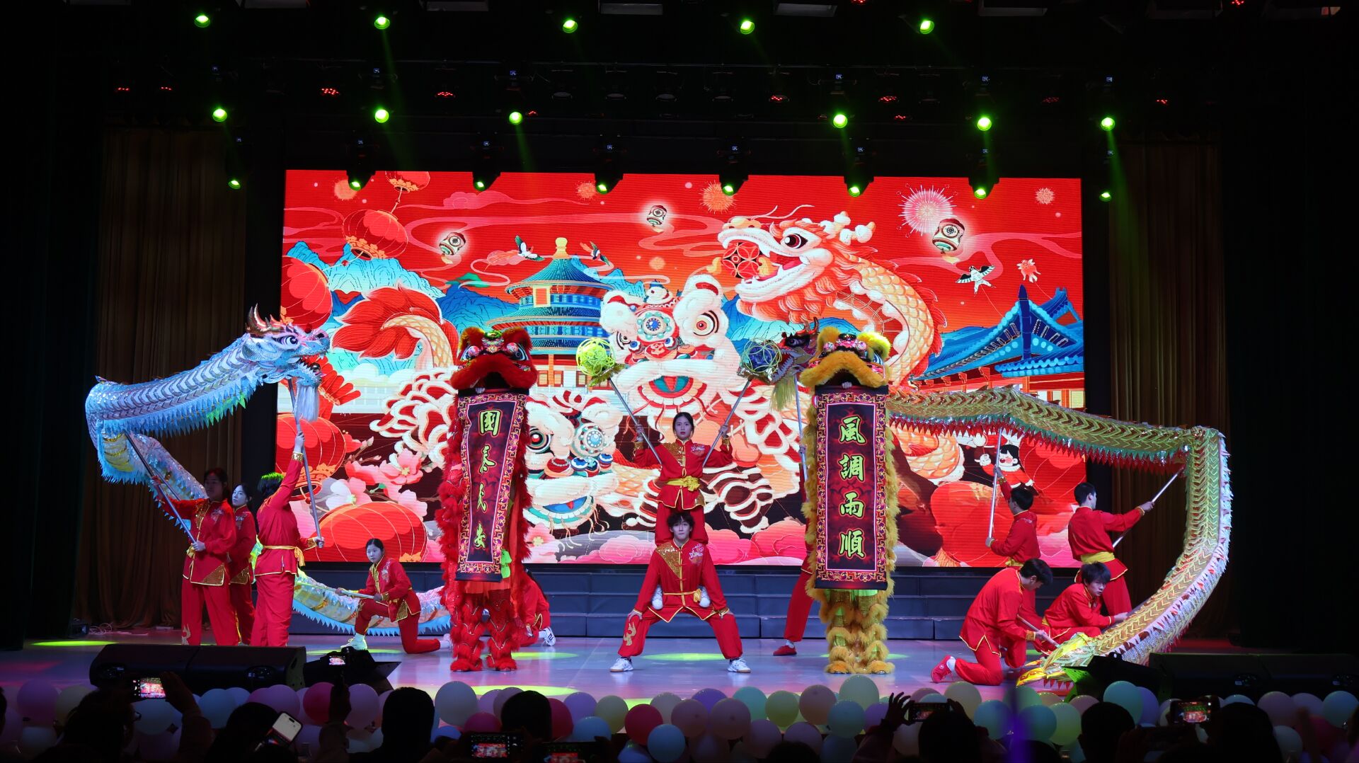晚会开始前,师生有序入场,大屏幕上循环播放教体学院主题宣传视频,展现学院“博雅育人”的丰硕成果。入场完毕后,活动主持人宣读《HSE安全规范》,强调活动安全注意事项,为晚会顺利开展筑牢基础。随着倒计时视频播放,全场屏息期待,金龙腾跃、醒狮欢腾的舞龙舞狮表演瞬间点燃现场,晚会正式拉开帷幕。
