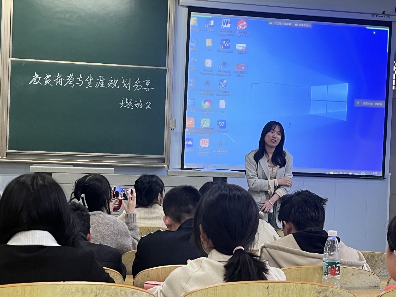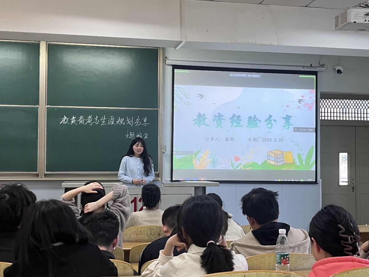随后,教育学专业龚萌学姐就教资的复习与报考作出了分享,她根据自己的教资备考经历为同学们详尽地介绍了教资报考的基本信息,对教资复习教材的选用乃至网课的选择都一一进行了多方面、多类别的推荐。