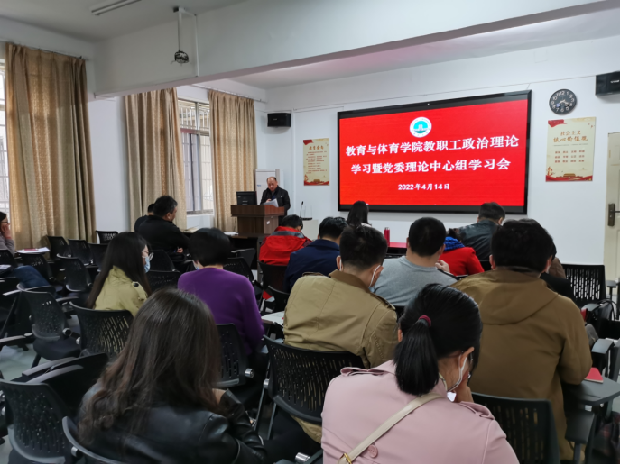 4月14日下午,教体学院在5教203召开4月份党委理论中心组学习暨全体教职工政治理论学习会。全体党委委员参与了本次学习,学习活动由分党委书记高明成主持。