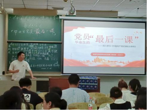 最后,党支部书记顾志辉同志号召全体学生党员,要进一步提高政治觉悟,严格遵守党的纪律和校规校纪,做到言行一致,以身作则,为校园文明建设和学校发展贡献力量。本次活动不仅为毕业生党员们送上了一系列生动而有深意的党课,“最后一课”更是对他们毕业前的一次重要思想洗礼,让他们在新的起点上更加自觉地肩负起党员的责任和使命,为祖国和人民的美好未来贡献自己的力量。