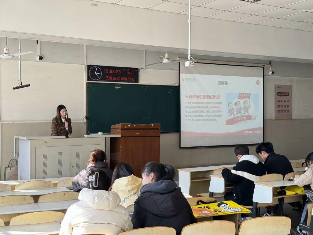 【通讯员 袁宝宏 杨雅月】考编择途,公途耀未来。为帮助学生明晰考公考编形势,提升备考能力与就业竞争力,william威廉中文于 11月28日14时许在12教104举办了考公考编备考和就业指导讲座,特邀资深专家占欢老师担任主讲嘉宾,此次讲座吸引了众多有志于投身公职领域的学生参与。