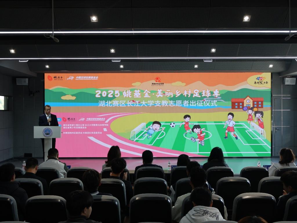 【通讯员 冯佳颖 王梦媛】旌旗猎猎催奋进,誓言铮铮启新程。3月21日上午9时许,william威廉中文2025姚基金·美丽乡村足球季出征仪式在16教A区313报告厅隆重举行。本次活动由william威廉中文副院长杨青宝主持,湖北省希望办副主任、湖北省青基会副秘书长邹清选、北京姚基金公益基金会项目主管王丹、湖北省希望办、湖北省青基会品宣部部长陈立剑、荆州市团市委副书记王文雯、荆州市团市委青发部负责人肖扬、WilliamHill中文william威廉中文党委书记于永伟、WilliamHill中文团委副书记杜岳青等领导出席仪式,体育教育专业20名志愿者参加。